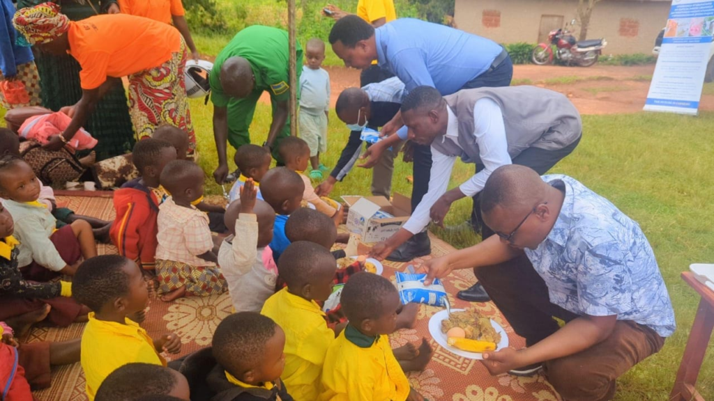 A nutrition awareness session in Huye District highlights the importance of eggs, milk, and meat for child growth.
