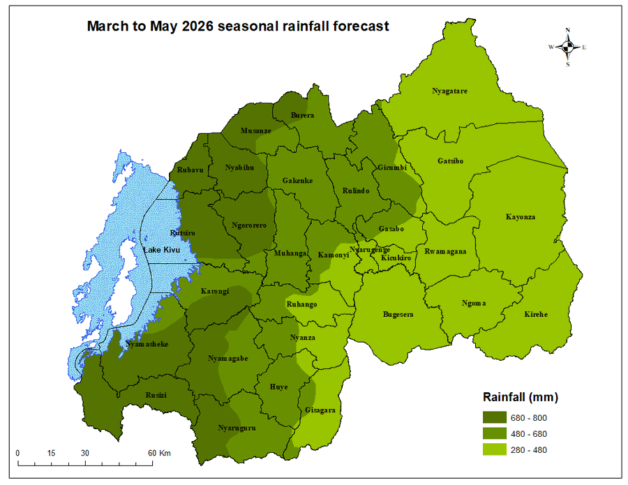 Western districts such as Rubavu, Nyabihu, Rusizi, and parts of Musanze are expected to receive the heaviest rainfall up to 800mm while Eastern districts like Kirehe and Kayonza will receive lower, but still significant, rainfall levels.